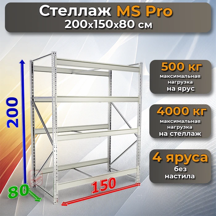 Прочный, универсальный и удобный стеллаж для гаража, склада, кладовой или торговой точки. Стеллаж MS Pro без настила – это отличное решение для тех, кто хочет самостоятельно выбрать материал полок (ДСП, фанеру или другой вариант). Конструкция легко собирается и выдерживает до 4000 кг нагрузки на секцию, что делает ее идеальной для хранения инструментов, оборудования и других тяжелых предметов.