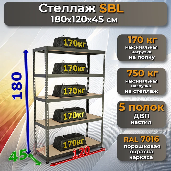 Стеллаж металлический с оцинковкой SBL 180х120х45 5 полок